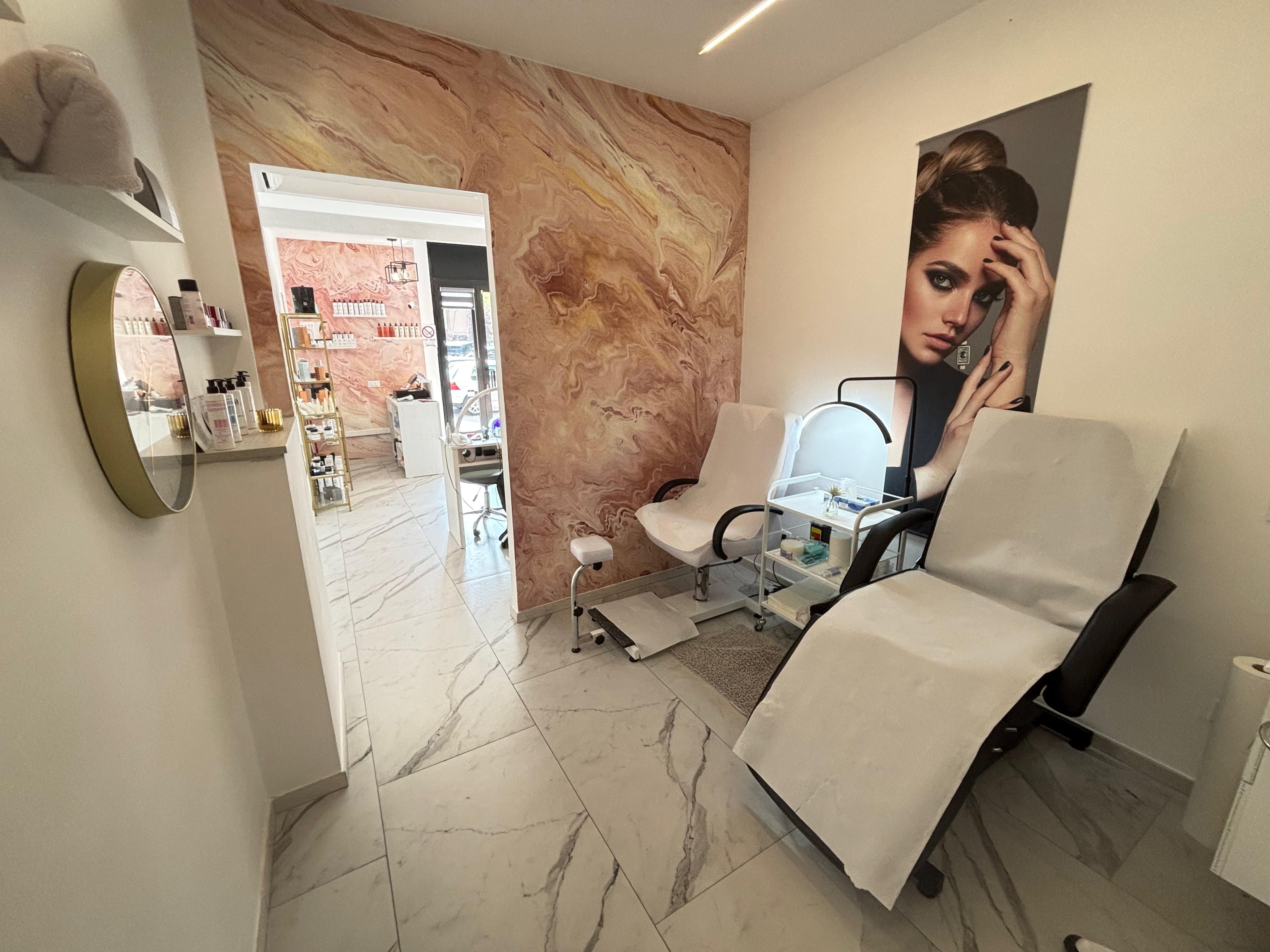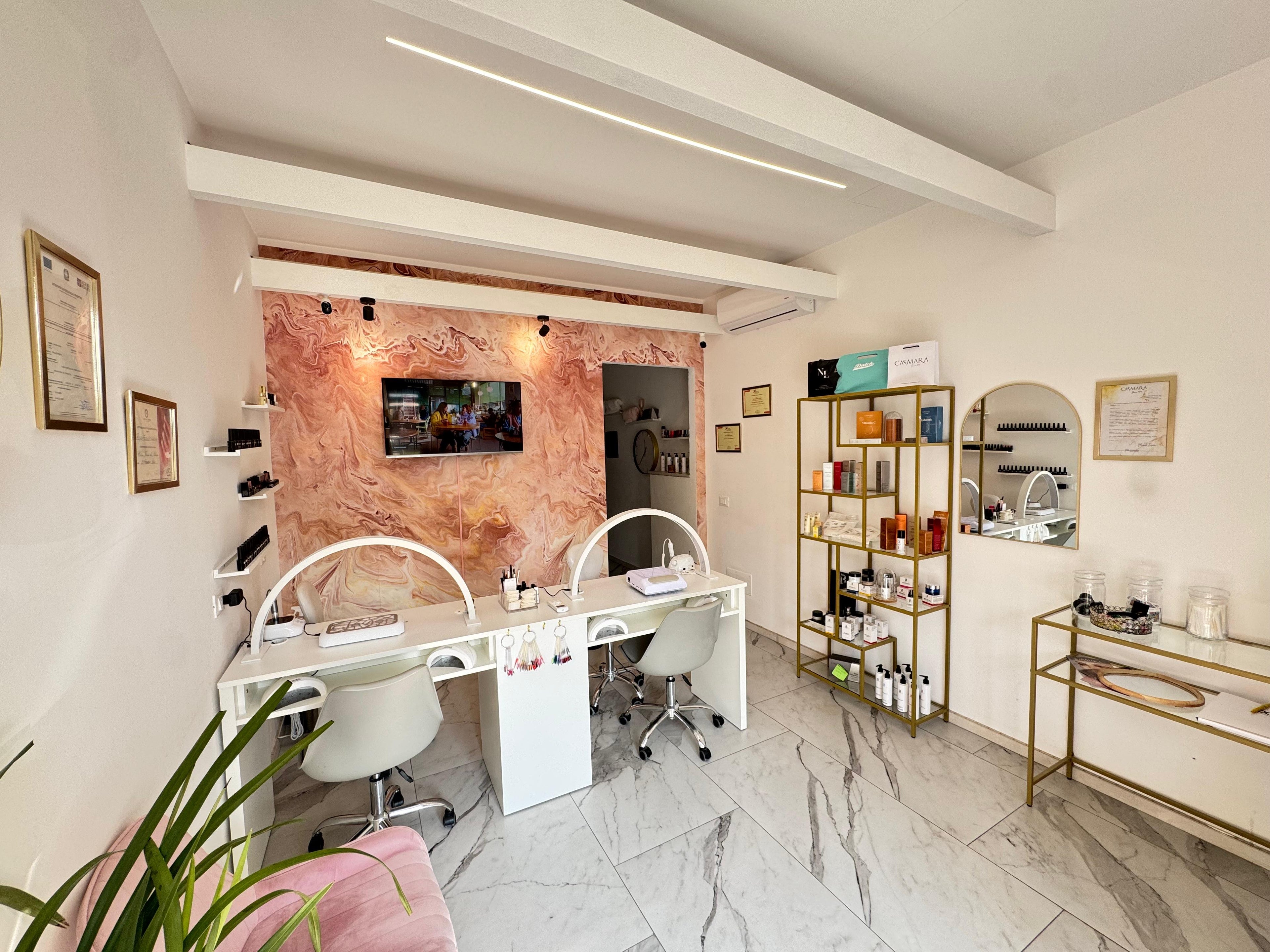 Benvenuti nella nostra luminosa e vibrante area dedicata alla cura delle mani e dei piedi. Due postazioni eleganti e ben attrezzate ti aspettano per una manicure, una pedicure o una nail art di tendenza. Il design moderno, con il contrasto tra l'oro degli scaffali espositivi e il marmo rosa, crea uno sfondo di lusso per i tuoi momenti beauty. Mentre ti prendi cura delle tue unghie, puoi goderti l'ambiente dinamico e scegliere tra la nostra vasta selezione di smalti e prodotti professionali esposti con cura. Il luogo ideale per chi cerca stile, igiene e la massima creatività.